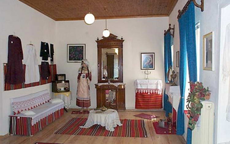Όλα τα εκθέματα είναι δωρεές των κατοίκων και των πολιτών του Πολυγύρου. Αυτά που βρίσκονται στον πρώτο όροφο είναι διαρρυθμισμένα έτσι ώστε αναπλάθεται το εσωτερικό ενός αστικού σπιτιού του 19ου αιώνα και αρχές του 20ου αιώνα, με δωμάτια υποδοχής (σαλόνι με σοφάδες και χαμηλά στρόγγυλα τραπέζια, τραπεζαρία, και τα υπόλοιπα έπιπλα που θα περίμενε κανείς να έχει ένα τυπικό αστικό σπίτι της Μακεδονίας), κρεβατοκάμαρες (με μεταλλικά κρεβάτια , ντουλάπες και κλινοσκεπάσματα), καθιστικό, κουζίνα (με όλες τις μαγειρικές συσκευές, καζάνια, ταψιά, τζάκι), και ένα άλλο δωμάτιο το οποίο περιέχει ένα παραδοσιακό αργαλειό. Αυθεντικές στολές της ευρύτερης περιοχής του Πολυγύρου εκτίθενται σε διάφορες γωνίες του σπιτιού.