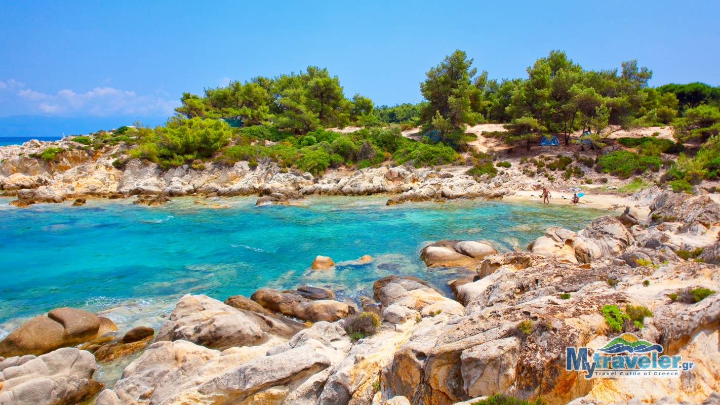 Μία εξωτική παραλία, κρυμμένη πίσω από ένα υπέροχο πευκοδάσος με κάτασπρες μικρές αμμουδιές, και τα κρυστάλλινα νερά, με άσπρα βράχια και πυκνά πεύκα που φτάνουν μέχρι το κύμα.