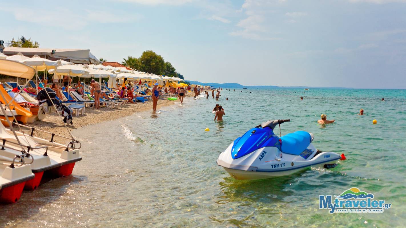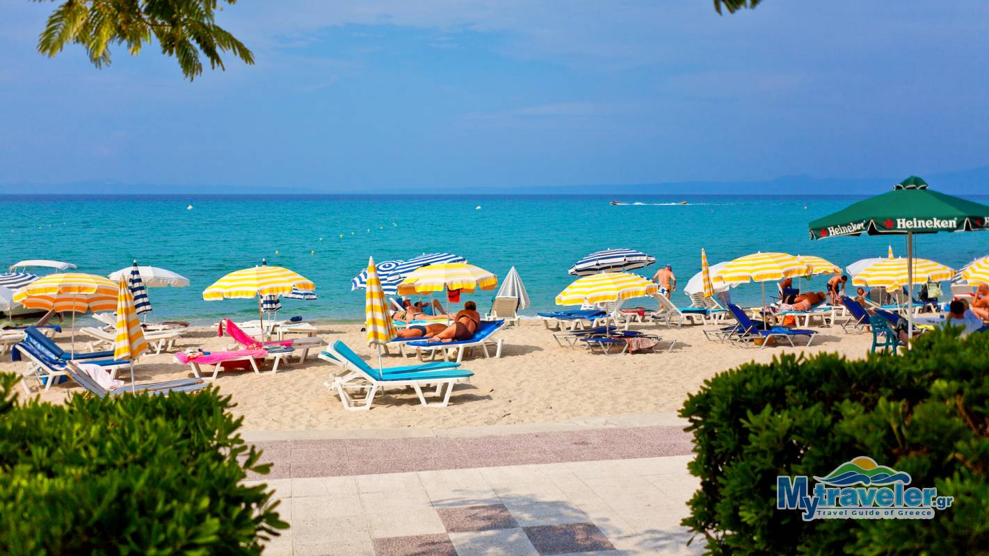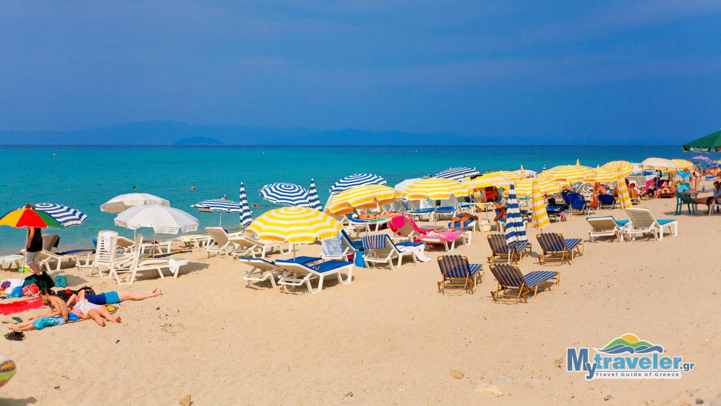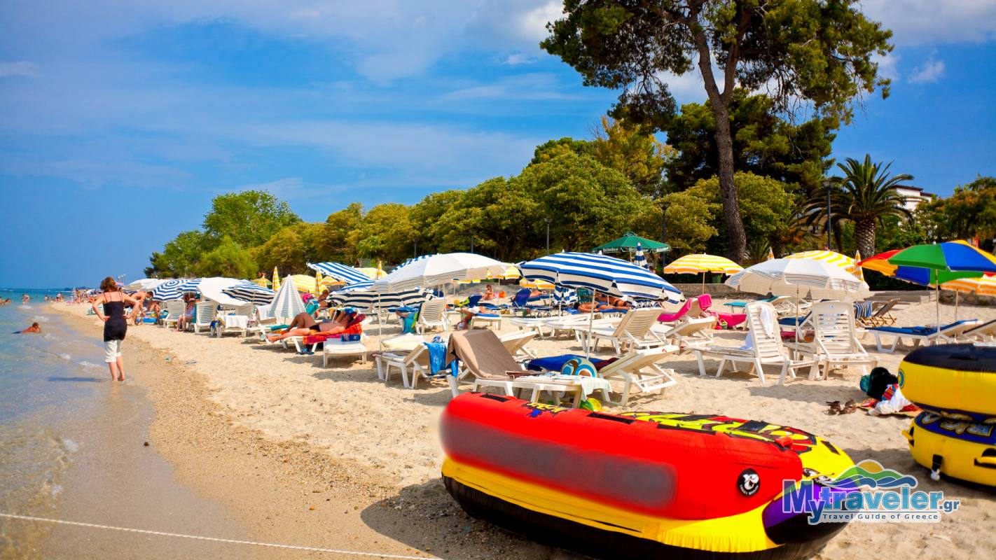 The beach features a sandy beach and crystal clear waters. It is located in front of the settlement Chanioti. You can find here umbrellas and sea beds. Near the beach you can find coffee shops, restaurants, bars and taverns. Also there are various sea sports available.