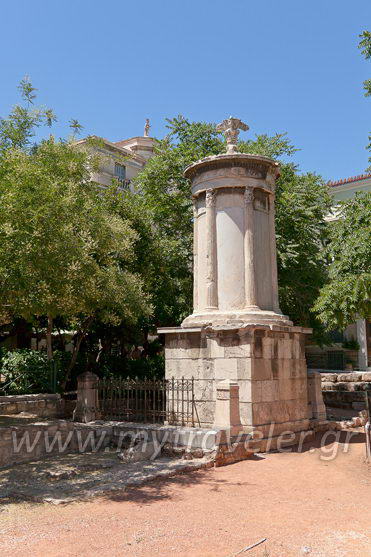 The circular building rests on a square podium of poros stone (2,93 m. long on each side), and consists of six Corinthian columns of Pentelic marble alternating with panels of Hymettian marble. The columns are among the earliest examples of the use of the Corinthian order in Athens.