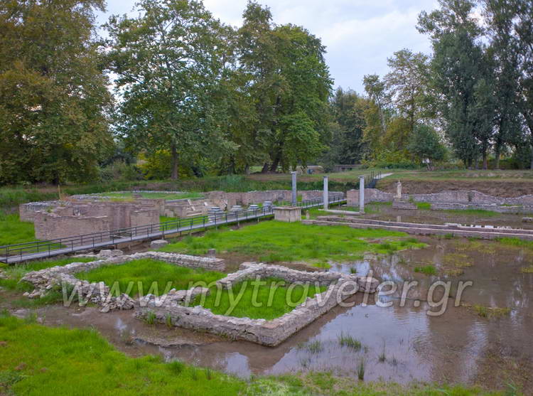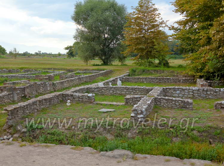 The excavation of the area commenced in 1982 and is continued at present by the University of Thessaloniki. It has brought to light a fortified city, surrounded by cult areas, that was inhabited continuously from the Classical period to Early Christian times. Buildings of various periods have been discovered in a series of different levels. Private residences, public buildings, shops, and a large number of workshops are erected in building blocks defined by the streets. On the south edge of the ancient city are the public baths (thermae), an imposing complex covering an area of over 4,000 square metres and dating from about A.D. 200.