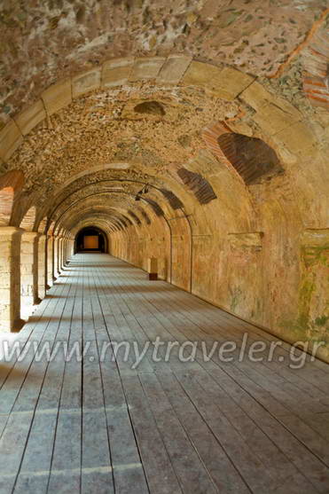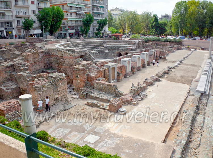 The Agora in a shape of a double L was open to the north (Olympou str.) overing about 20 hectares. Around a rectangular marble-paved square, three double stoas with Corinthian columns was in front of each wing, where there were all public services (mint, archives, justice court etc) of the city, capital of the Province of Macedonia. To the south (Filippou str.) the wing stand on a double underground stoa (Cryptoporticus). To the south of the cryptoporticus is a row of twenty shops open to a, two and a half meters wide, marble- paved street. This great complex was not only an administrative centre but also here gathered all the citizens and the visitors of the city. In the 5th century the Agora was abandoned and in the square reappear pottery activities with new clay pits. Only the use of the shops continued till 13th-14th c.AD. After the 5th century AD the Cryptoporticus was transformed to a cistern.
