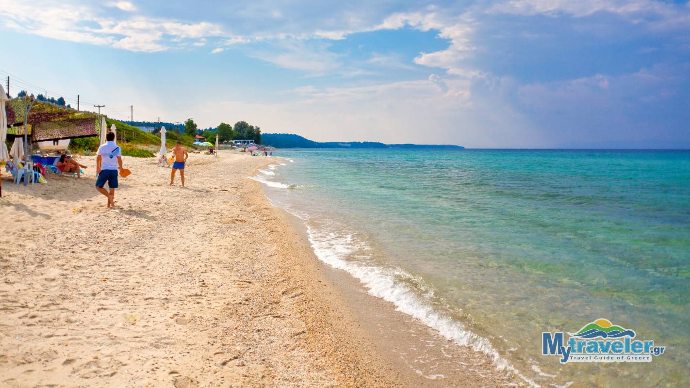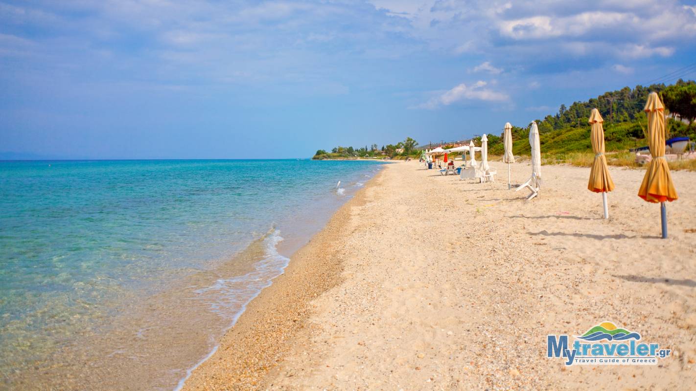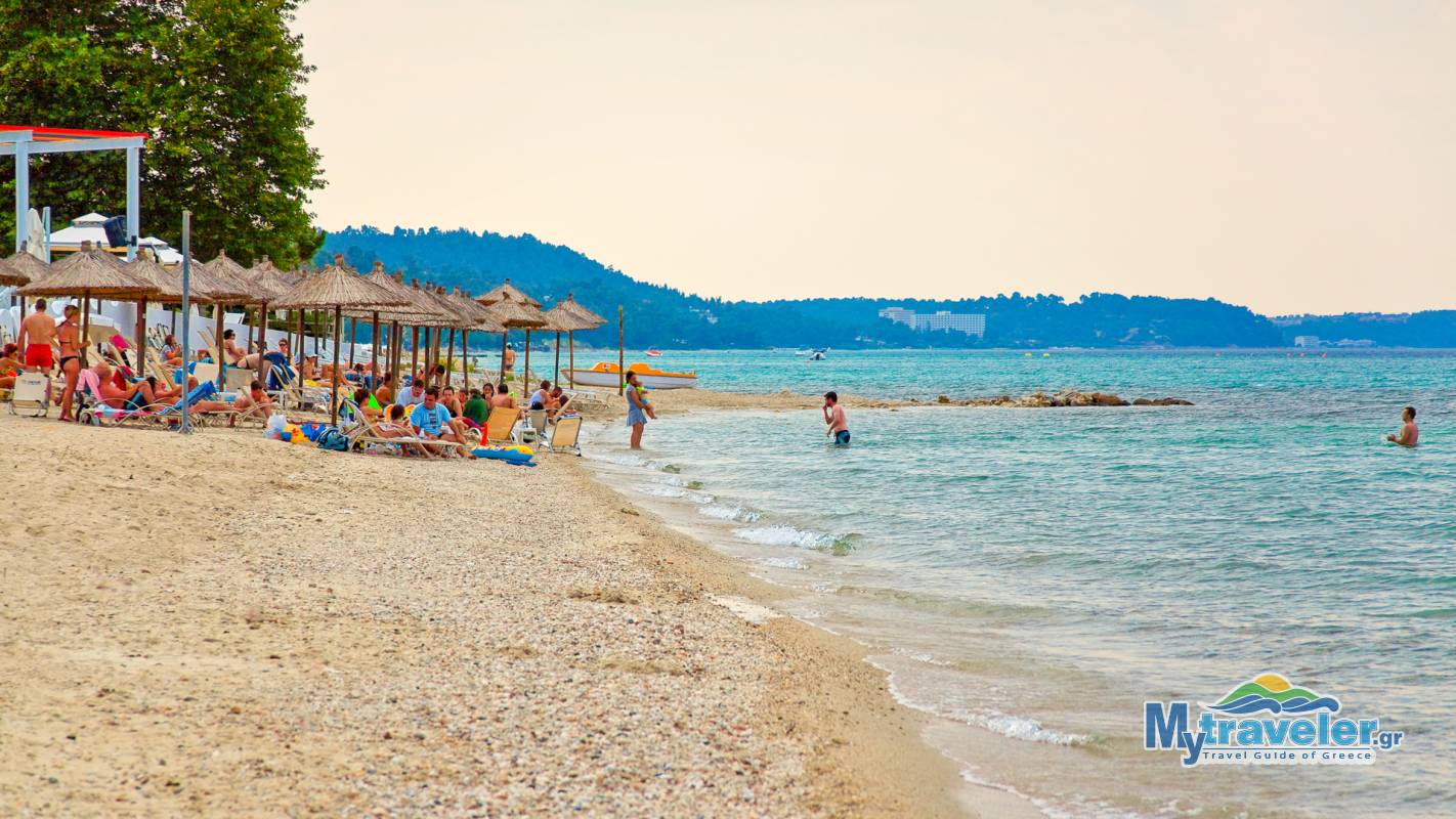 A big organized sandy beach with crystal clear blue waters.