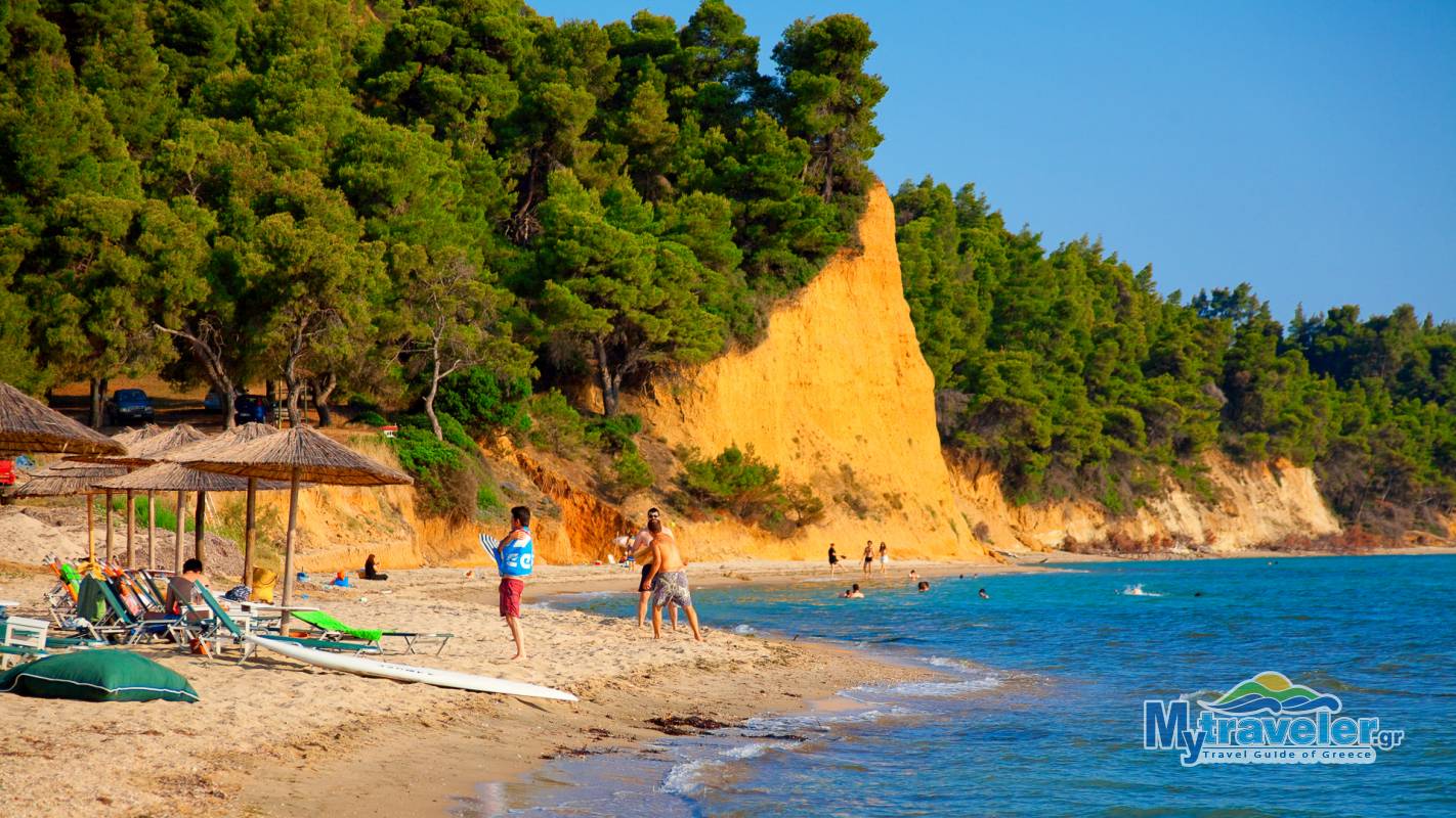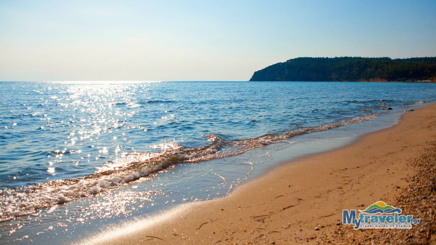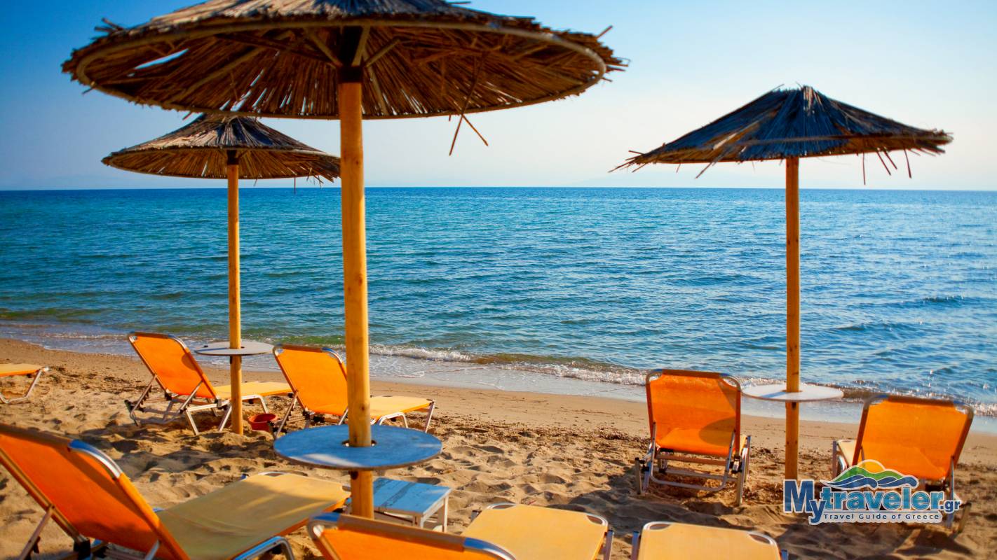 A sandy beach with crystal clear blue waters, south of the cosmopolitan beach Sani. It is well organized with sea beds, umbrellas and beach bars. Ideal for sea sports.