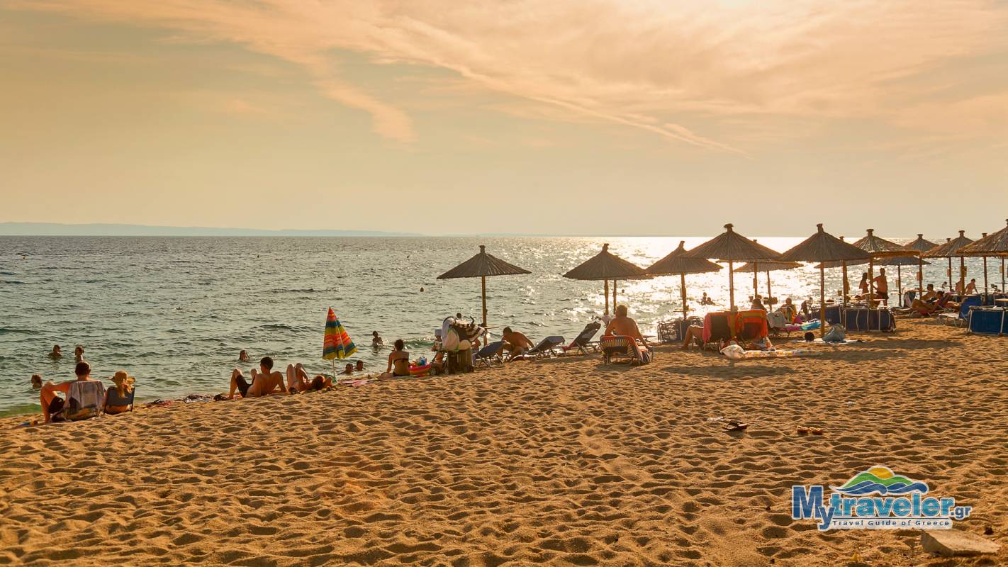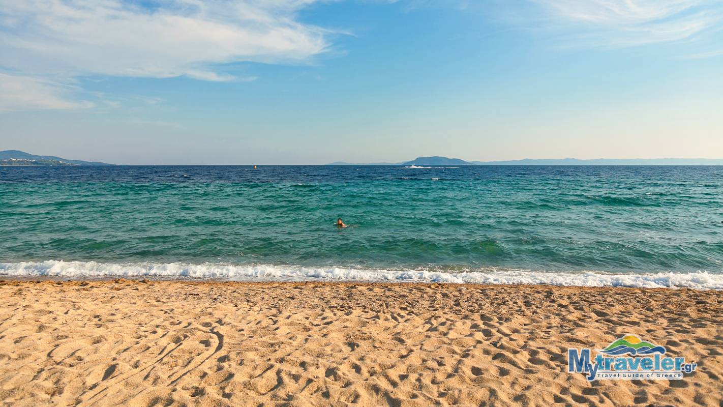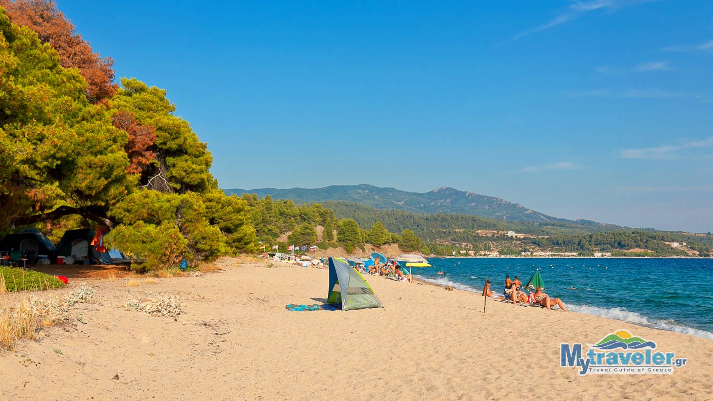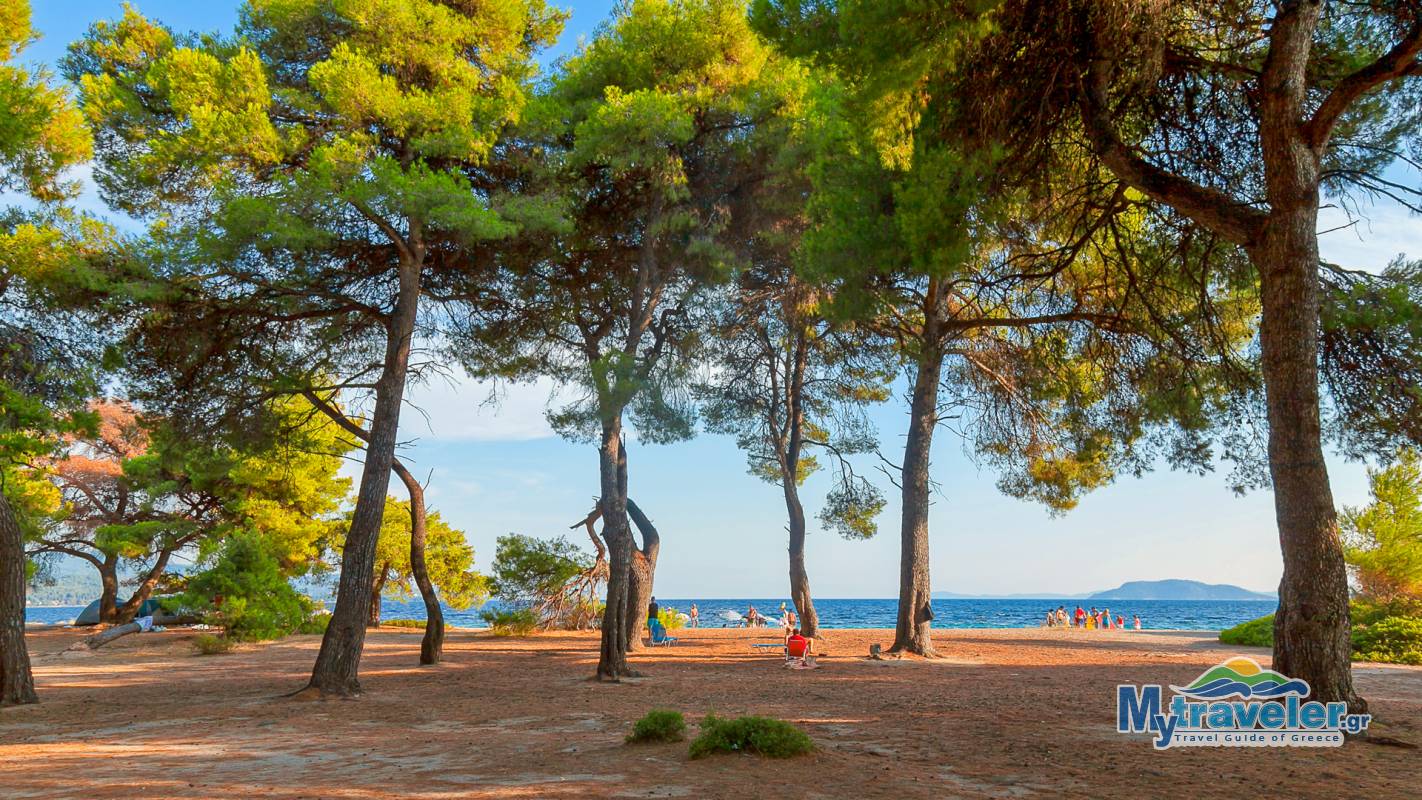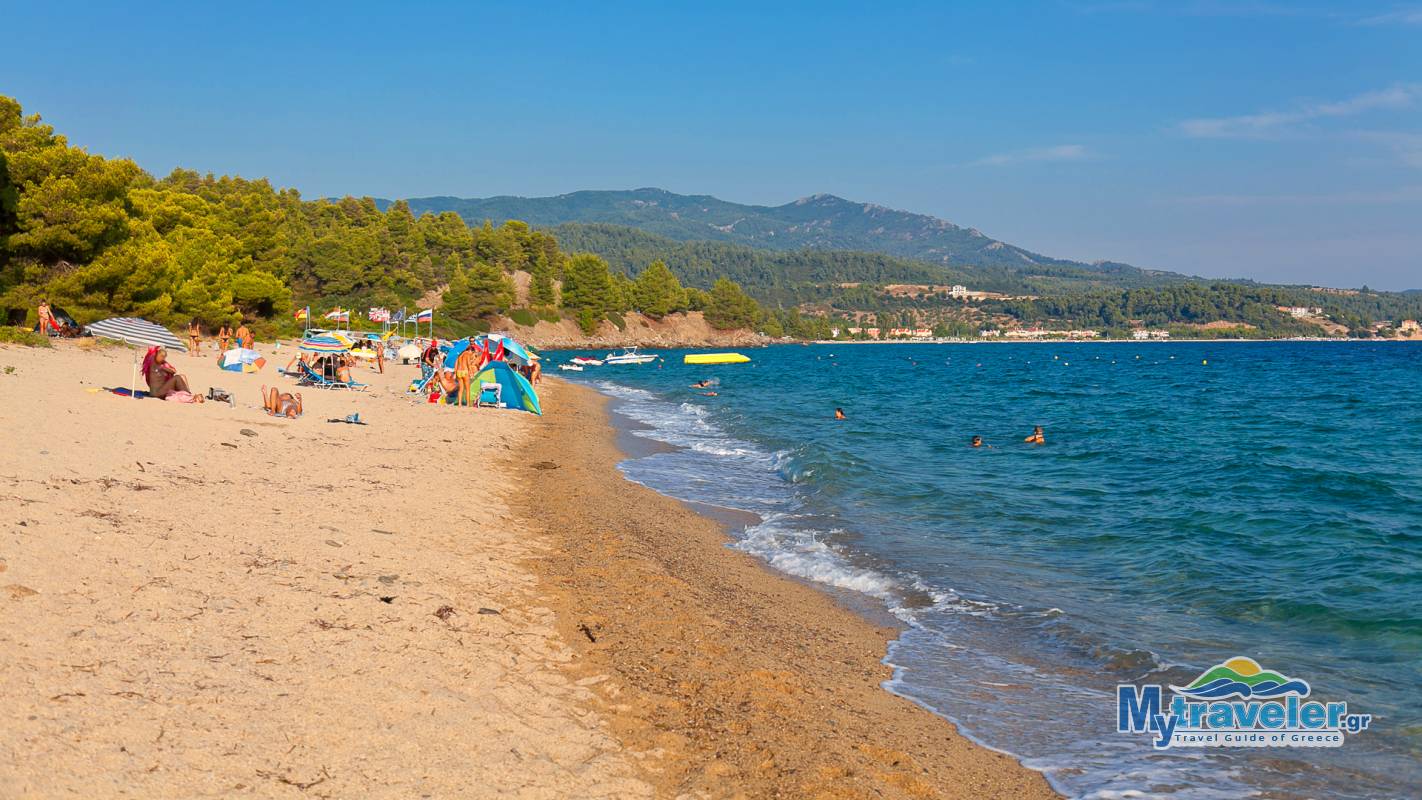 The waters are crystal clear and the sand is soft and fine. There you can find a bar, restaurants and water sports. A pine tree forest is near the beach.