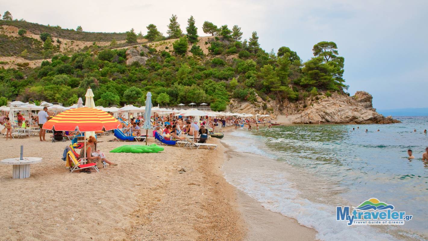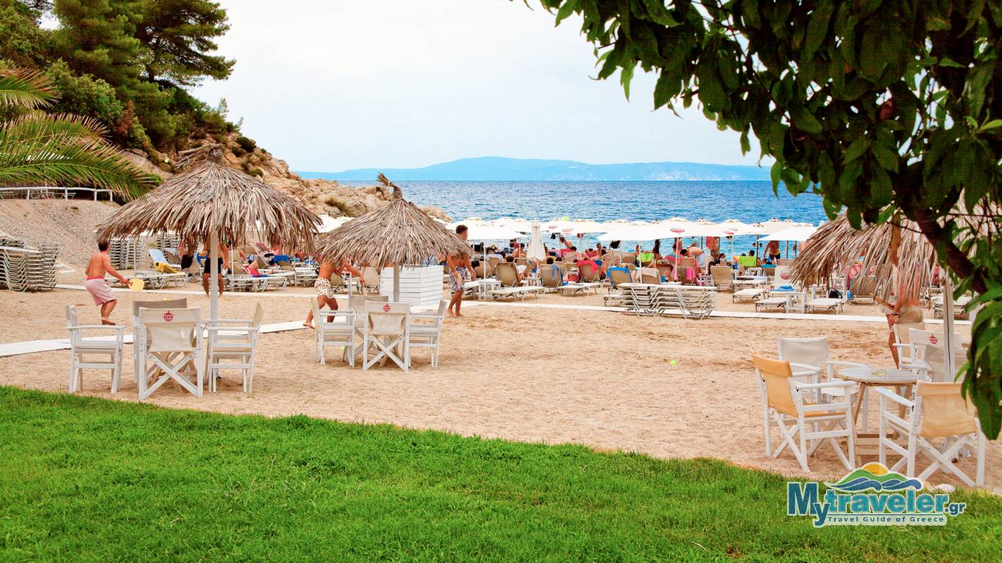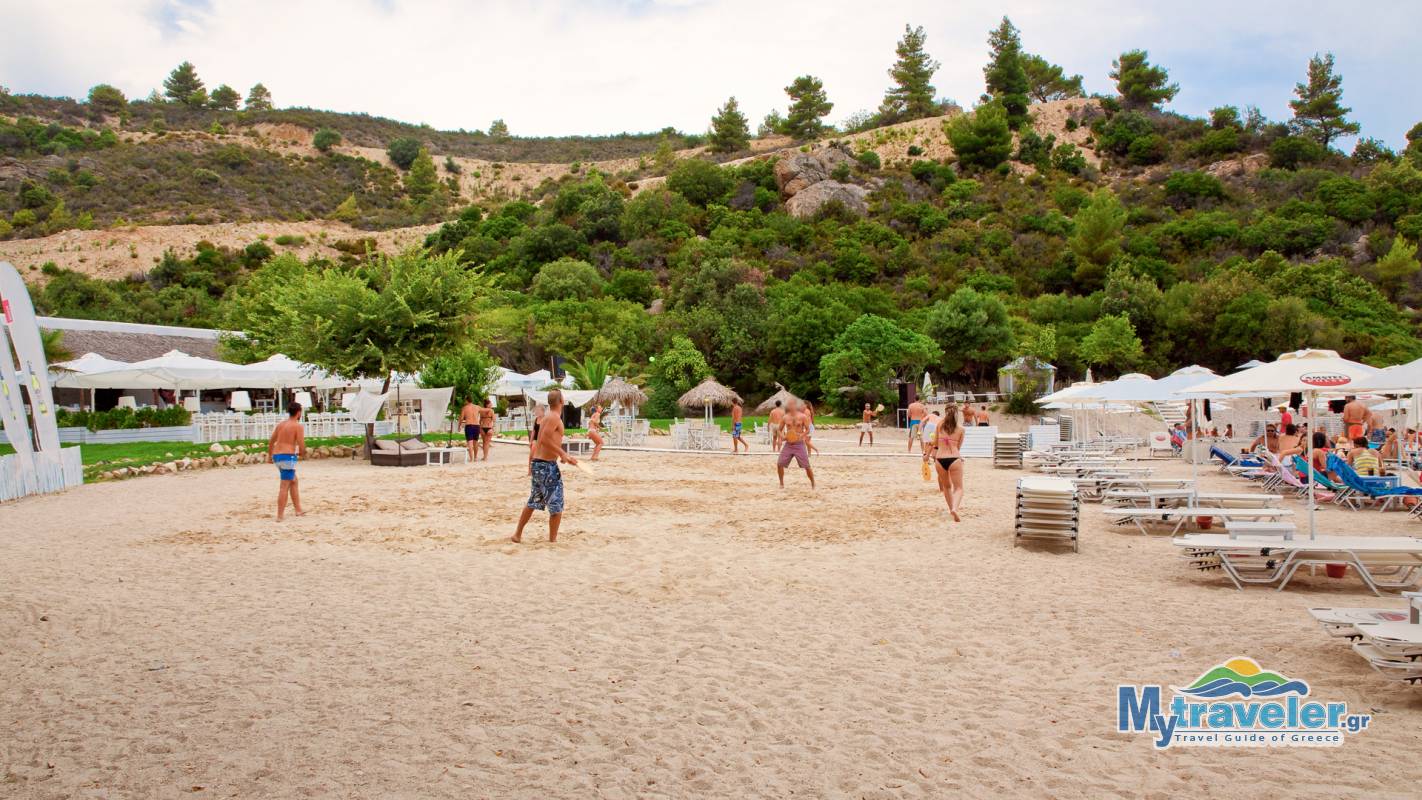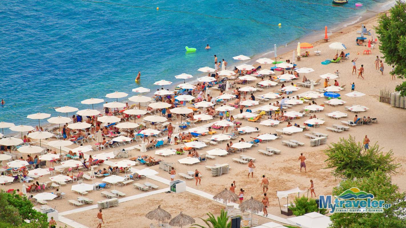 A well organized and a bit crowded beach with clear blue-green waters and a beach bar. You can reach it through the dirt road.