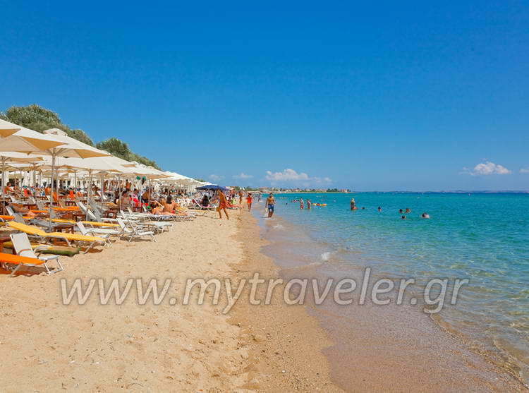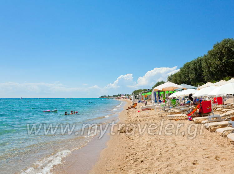 A sandy beach about one kilometer in length with crystal clear water. The depth of the sea floor increases gradually and you can find sea sports facilities. A well organized beach with lots of beach bears. Nearby you can find taverns, coffee shops and more.