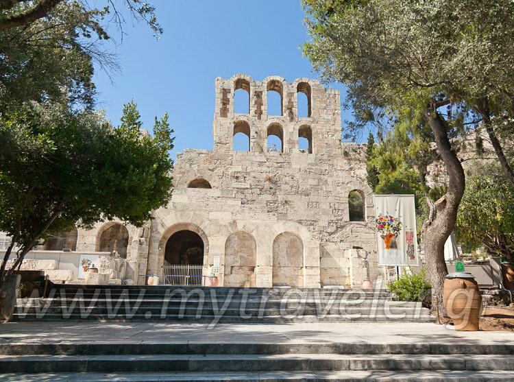 The famous Herod Atticus Odeon dominates the western end on the south slope of the Acropolis. It was the third Odeon constructed in ancient Athens after the Pericles Odeon on the south slope (fifth century) and the Agrippa's Odeon in the ancient Agora (15 BC). The construction of the monument during the second century AD was sponsored by Tiberius Claudius Herod Atticus, renowned offspring of an important Athenian family and a benefactor; he thus acted in remembrance of his wife Regilla, who died in 160 AD. The exact date of construction is unknown, but it was certainly built sometime after Regilla's death and 174 AD, when the traveller and geographer Pausanias visited Athens and referred to the monument in great admiration.