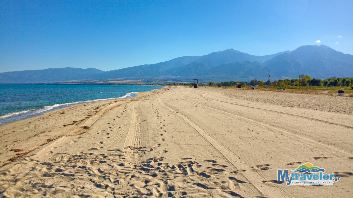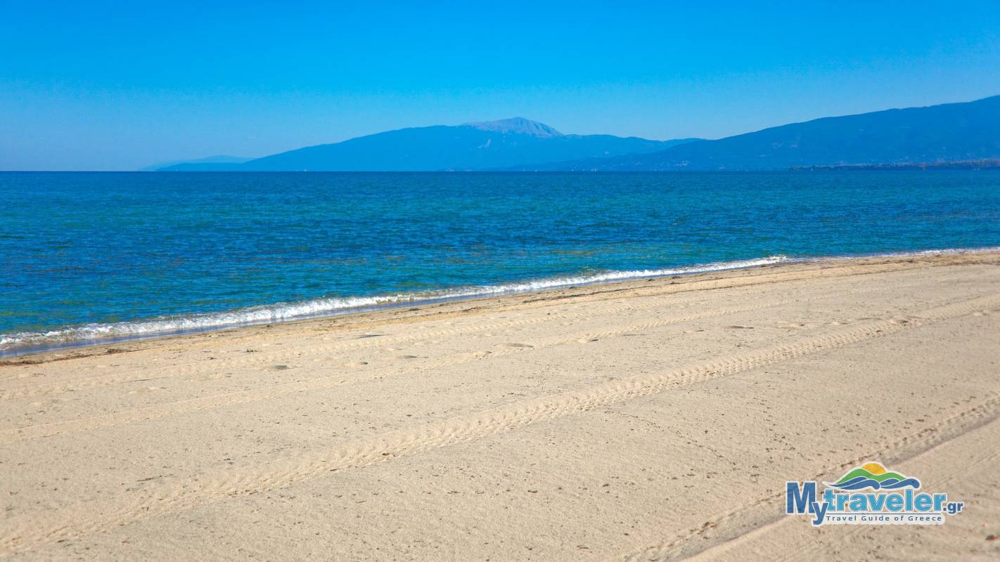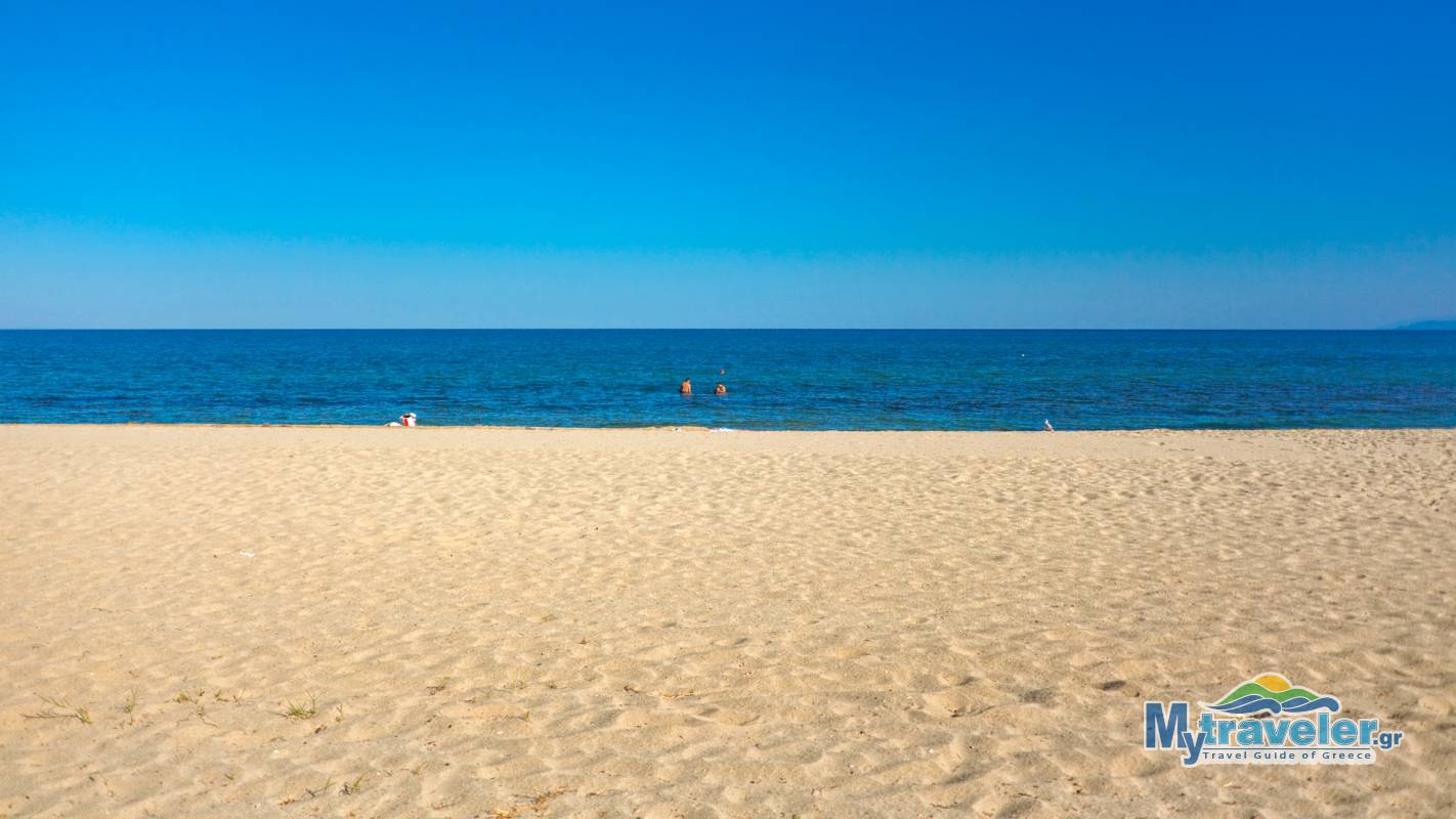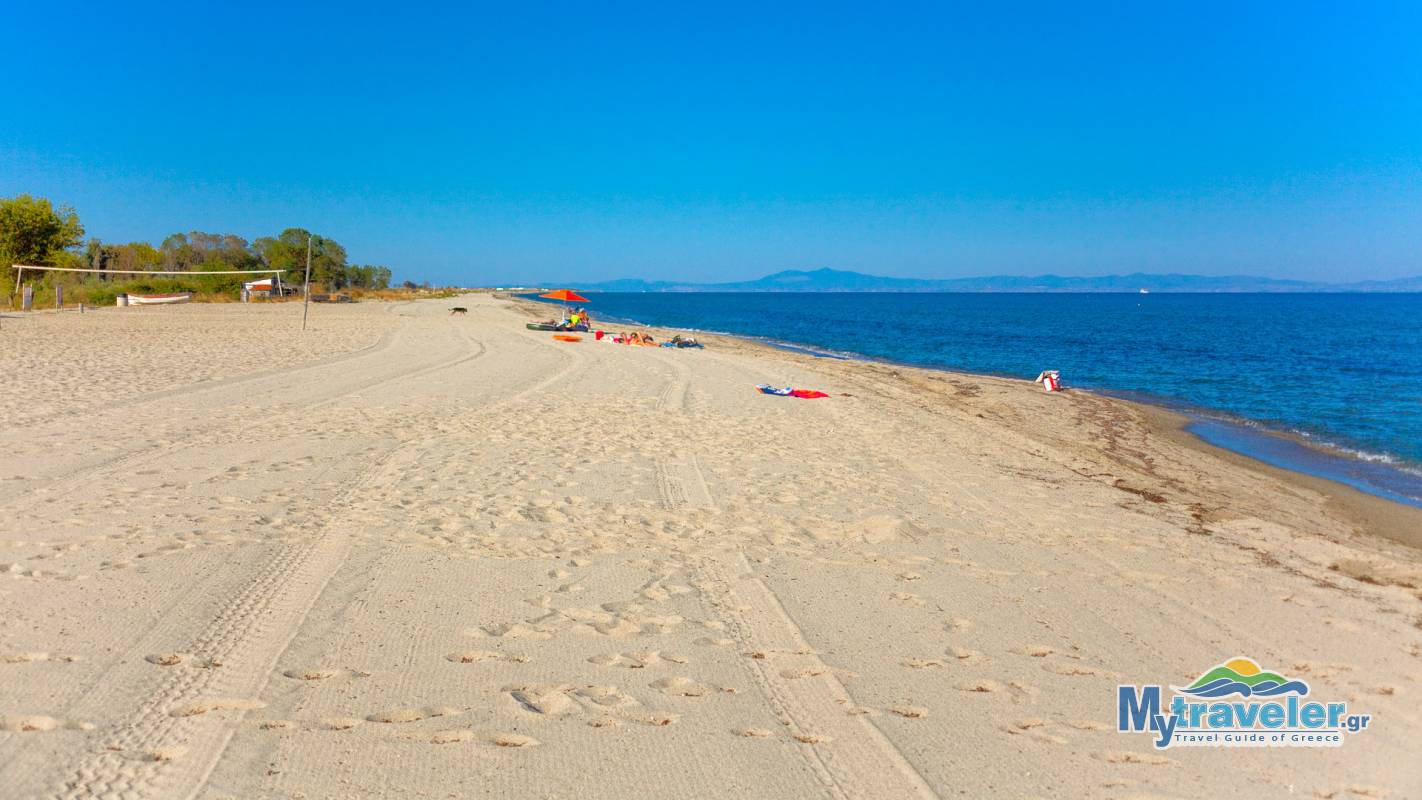 A quiet and big beach, combining pebbles and sand. The sandy beach and shallow waters is ideal with families with small children. At the south and west of the beach you can find lots of small and isolated bays.