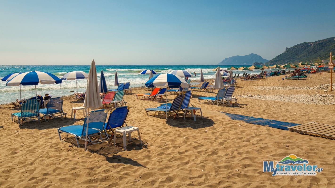 με άμμο και βότσαλο, η οποία διαθέτει ξαπλώστρες, ομπρέλες και