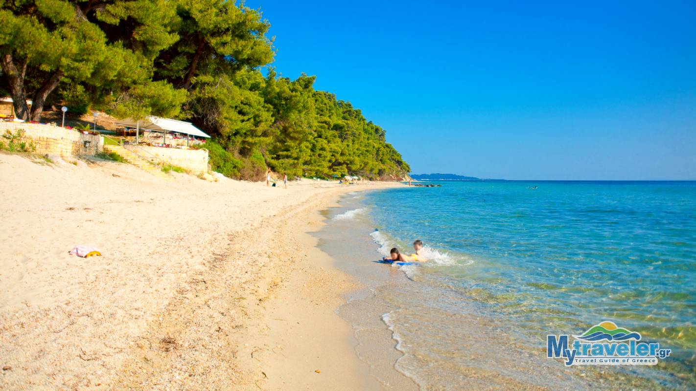 Όμορφη αμμώδες παραλία με καταγάλανα νερά και κατάμεστη με πεύκα και πρασινάδα. Κοντά στην παραλία υπάρχουν ταβέρνες και καφέ.
