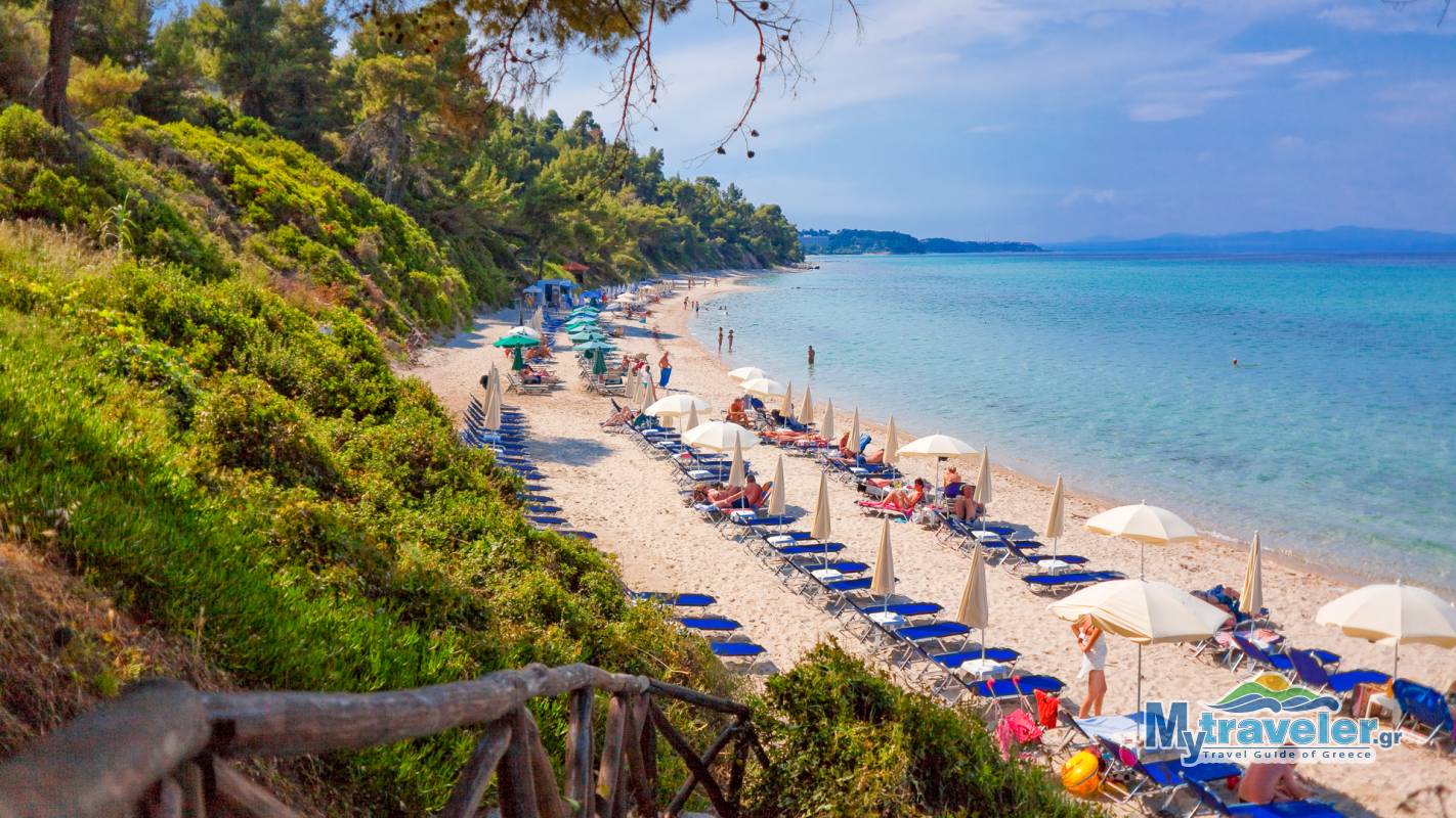 Красивый, большой песчаный пляж с великолепным видом на залив Ситония, с кристально чистой водой, окруженный соснами. Здесь можно наслаждаться всеми видами водного спорта. Пляж обустроен и предлагает  разные  услуги отдыхающим.