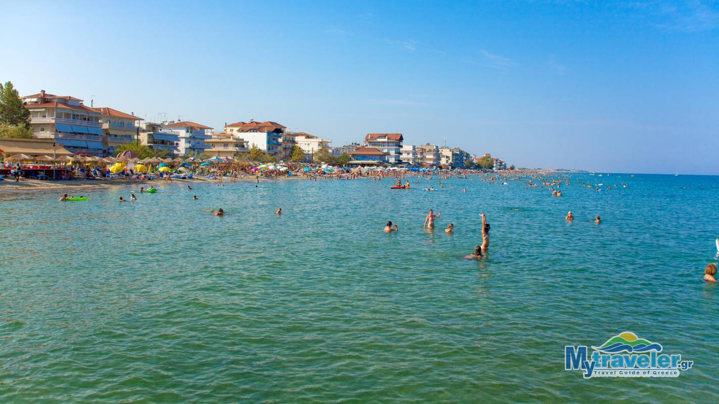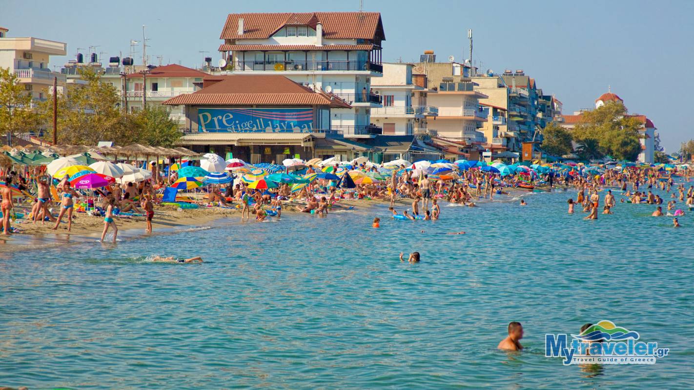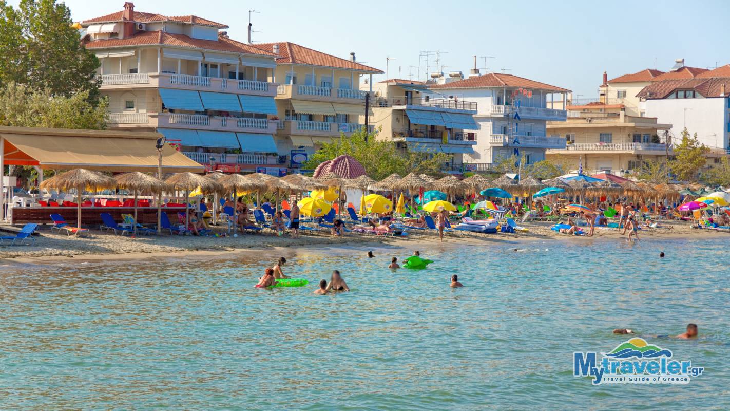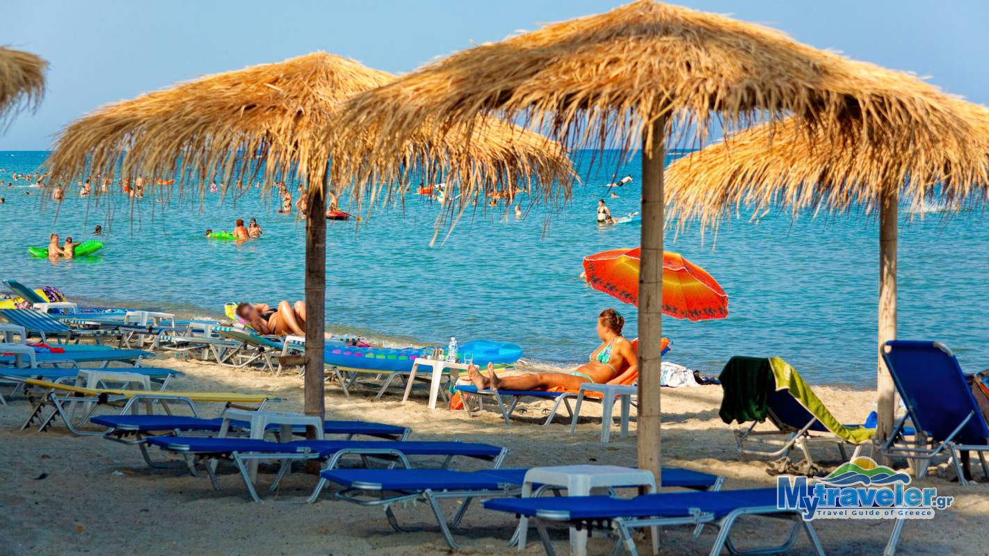 Длинный песчаный пляж с мелким, чистым песком и неглубоким морем, с кристально чистой водой. Пляж организованный, предлагаются водные виды спорта и каждое лето его посещает очень много туристов. Недалеко расположены таверны, бары, рестораны, магазины сувениров, также имеется порт для швартовки малых судов.