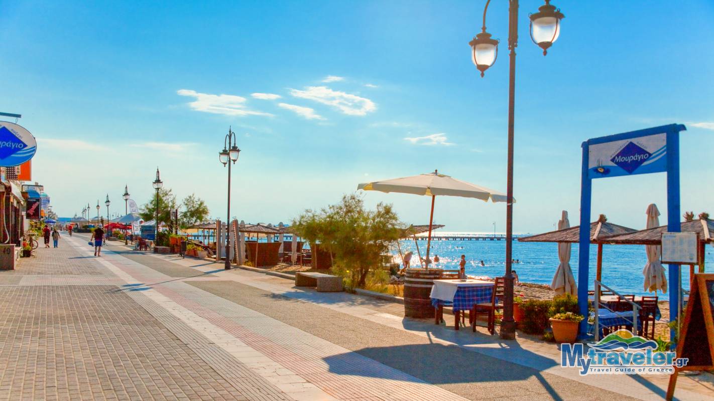 Обустроенный песчаный пляж с кристально чистой водой. На берегу находятся таверны, рестораны и бары. Расположен в 22 км от г. Салоники.