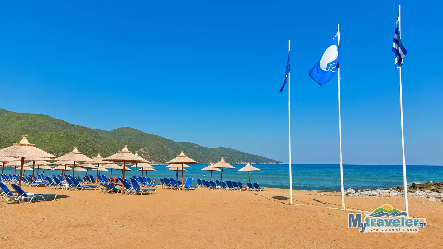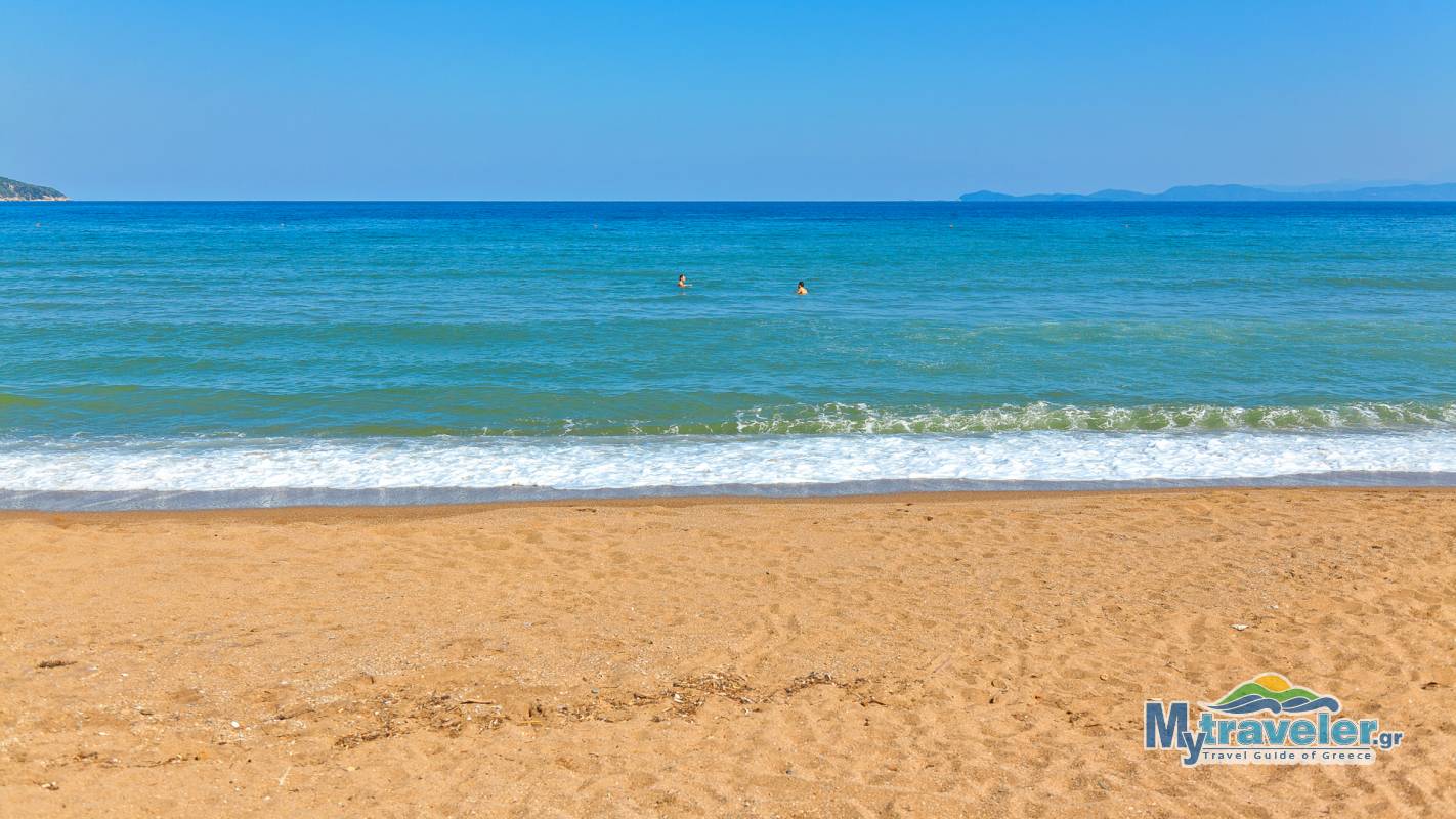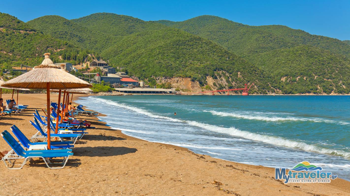 Пляж расположенный на берегу деревушки Стратони. Вода здесь прозрачная а берег песчаный с мелкими камушками.