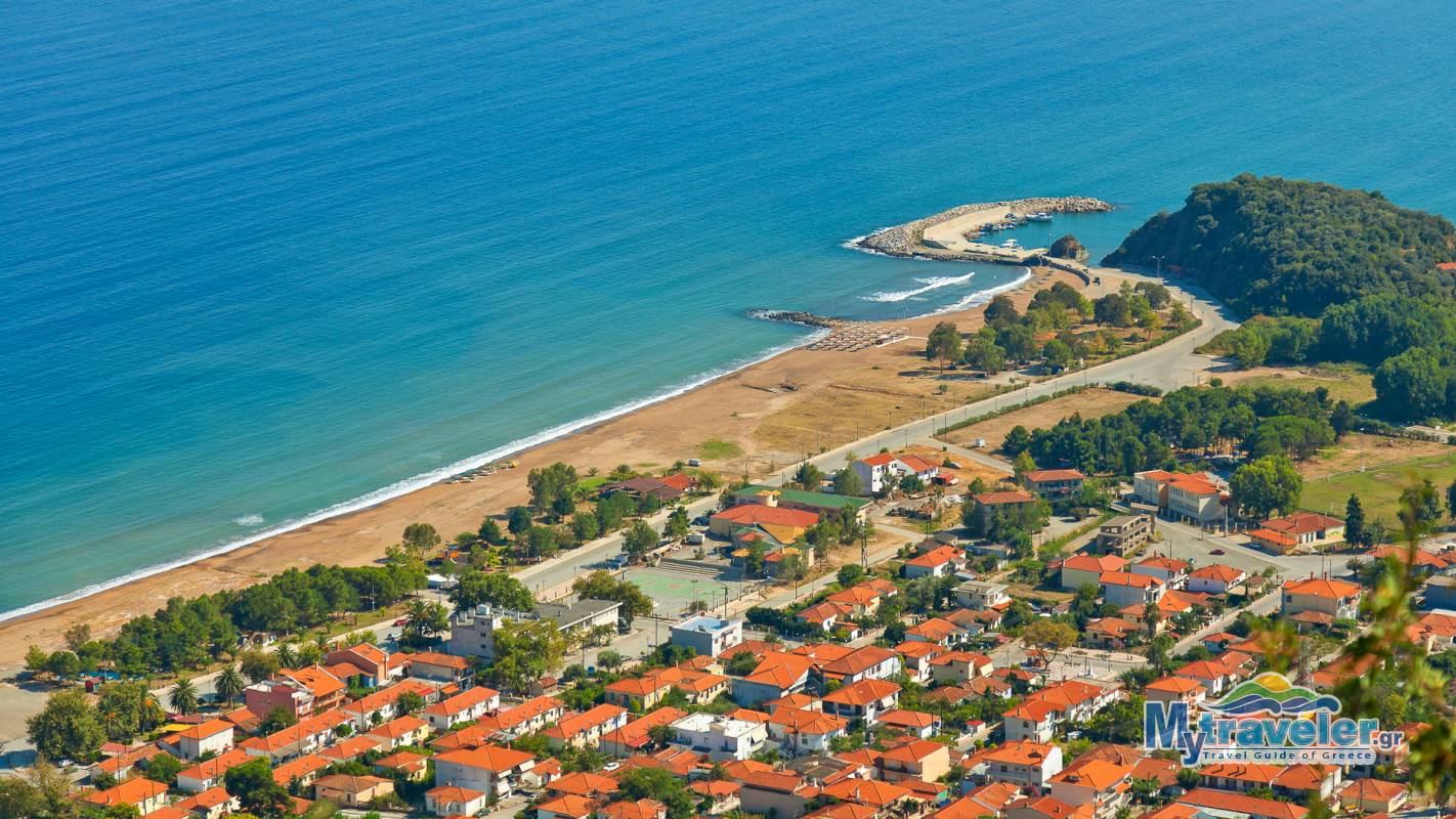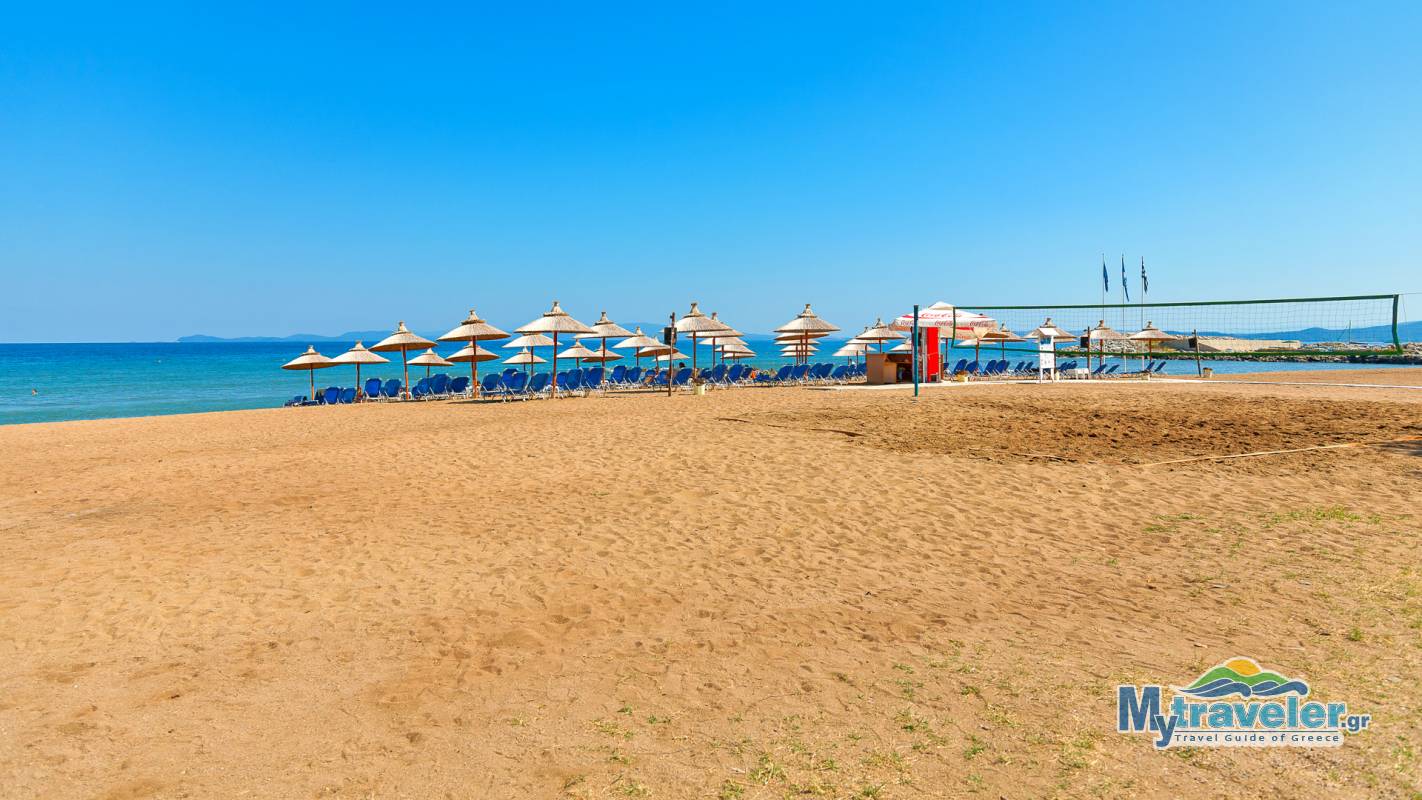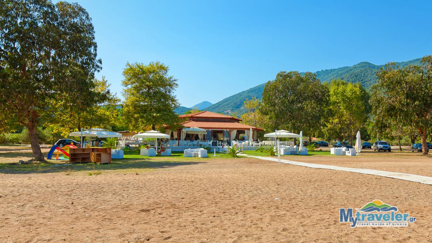 Пляж расположенный на берегу деревушки Стратони. Вода здесь прозрачная а берег песчаный с мелкими камушками.